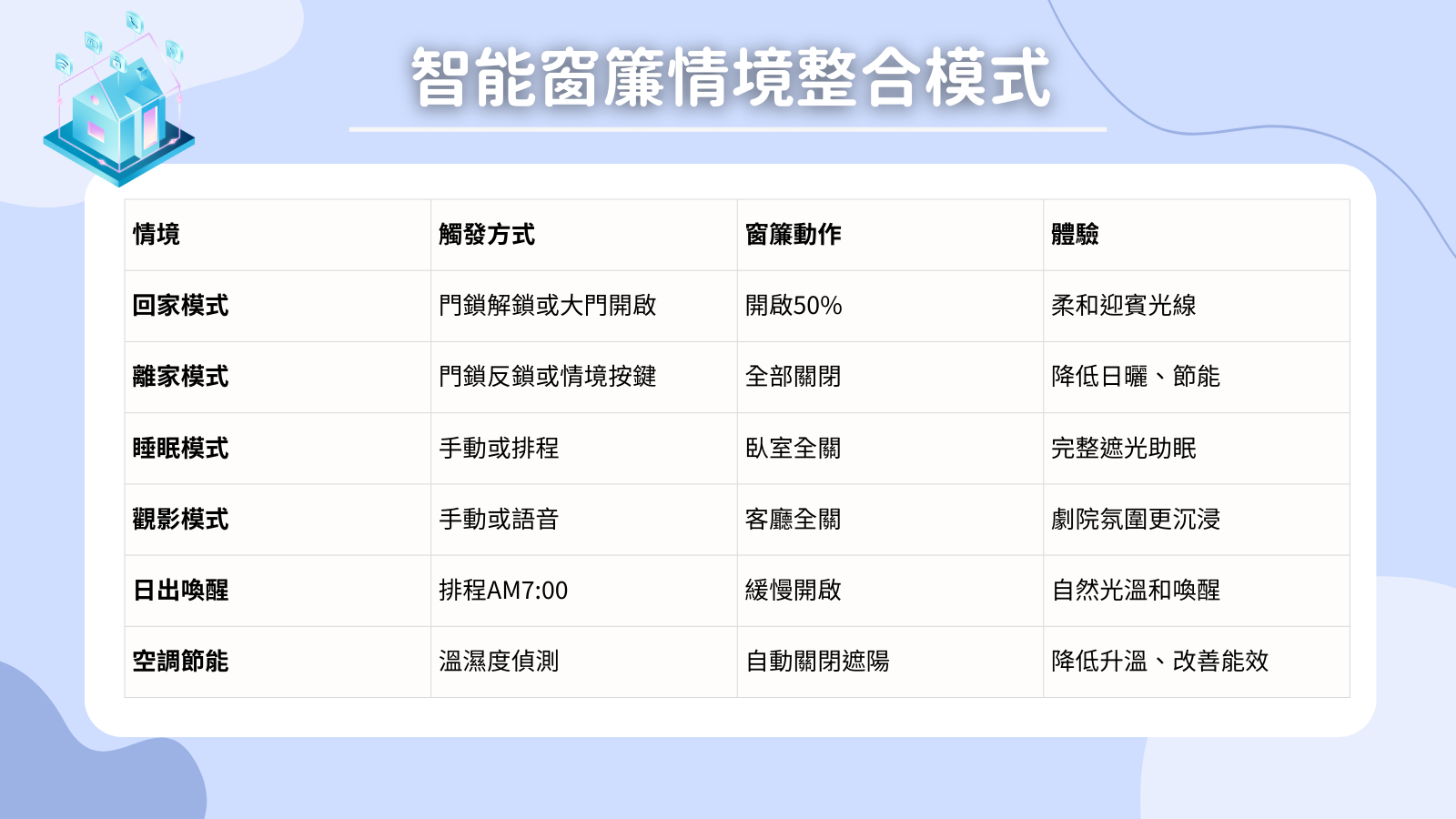 | 離家模式 | 門鎖反鎖或主情境觸發 | 全部關閉 | 降低日曬、節能省電 |