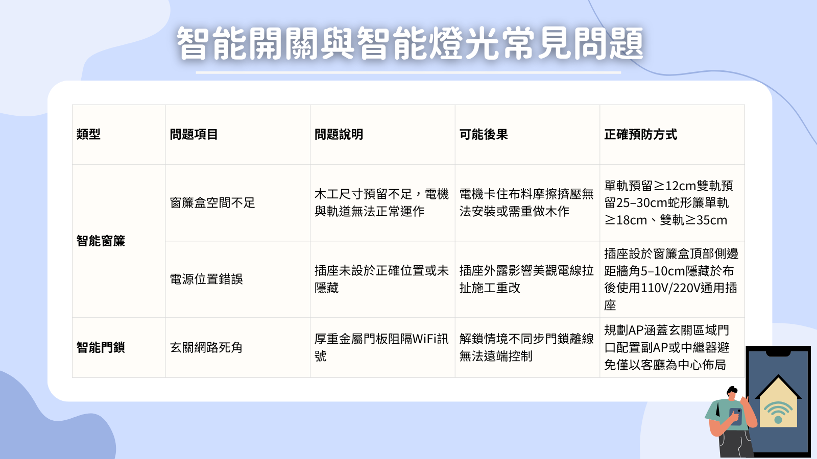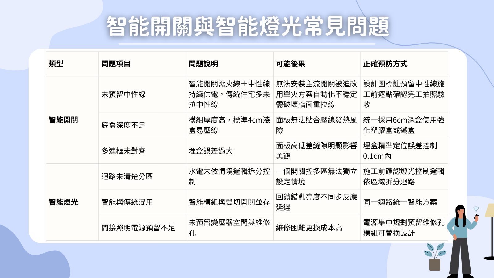 這些設備有一個共同特性:全部都與配線、盒位、電源或網路有關。一旦牆面完成、天花板封板,錯誤幾乎都只能用破壞式補救。