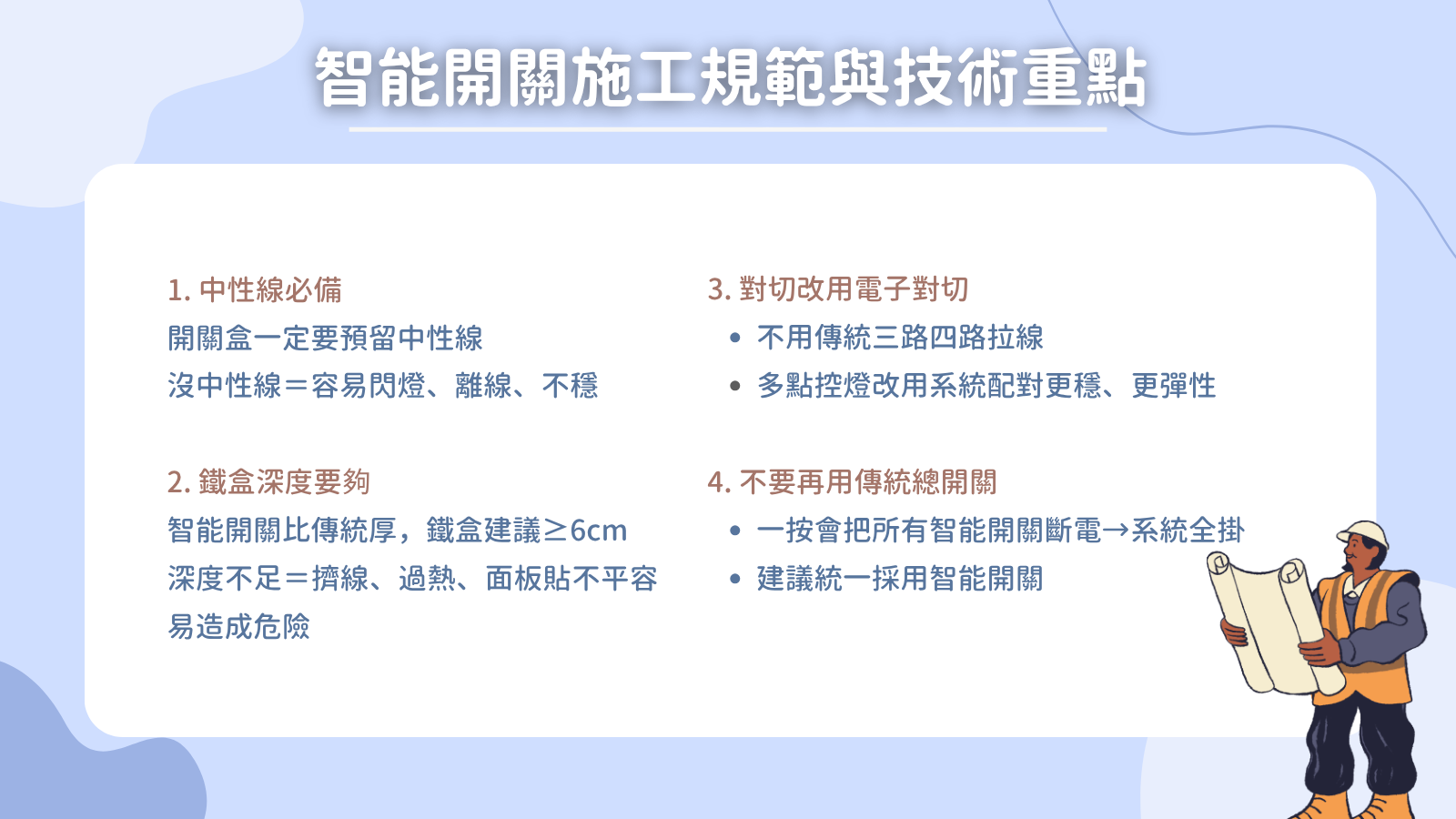 從中性線預留、鐵盒深度、對切方式,到情境邏輯與總電源處理,每個環節都會在交付後反映在使用體驗中。